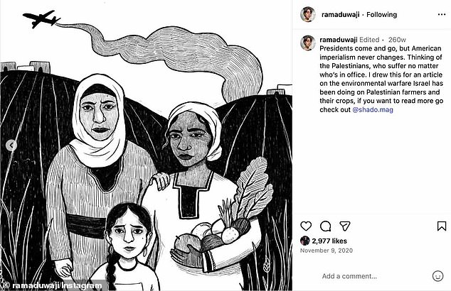 Another example of Duwaji’s art came in November 2020, when she posted a drawing depicting a Palestinian family on their land with an Israeli plane flying overhead. The caption read, “Presidents come and go, but American imperialism never changes. Thinking of the Palestinians, who suffer no matter who's in office.” This piece also drew attention for its bold political messaging.