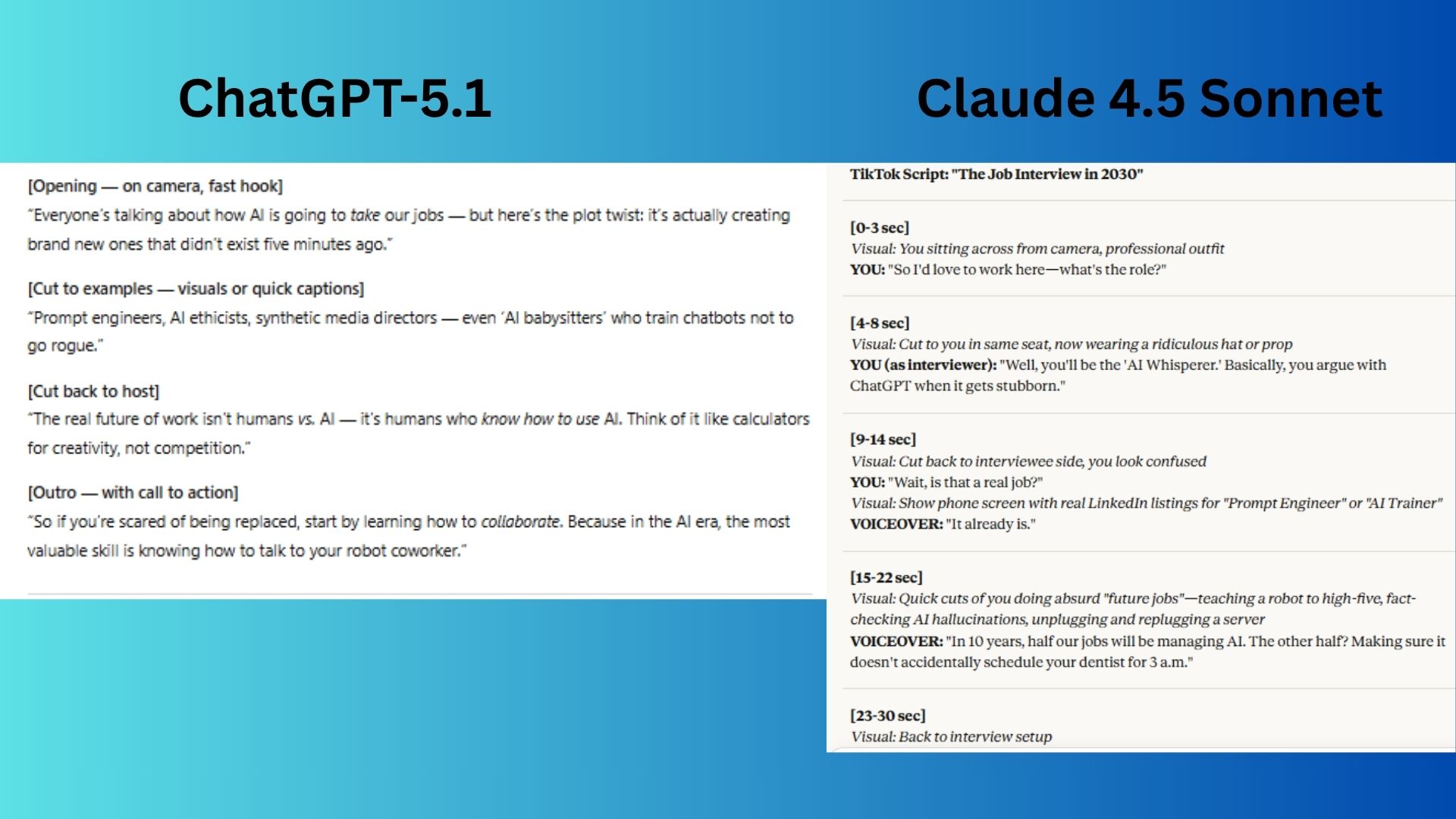 Claude 4.5 Sonnet created a highly engaging, character-driven script that uses visual comedy and a relatable scenario to make its point about the future of work.