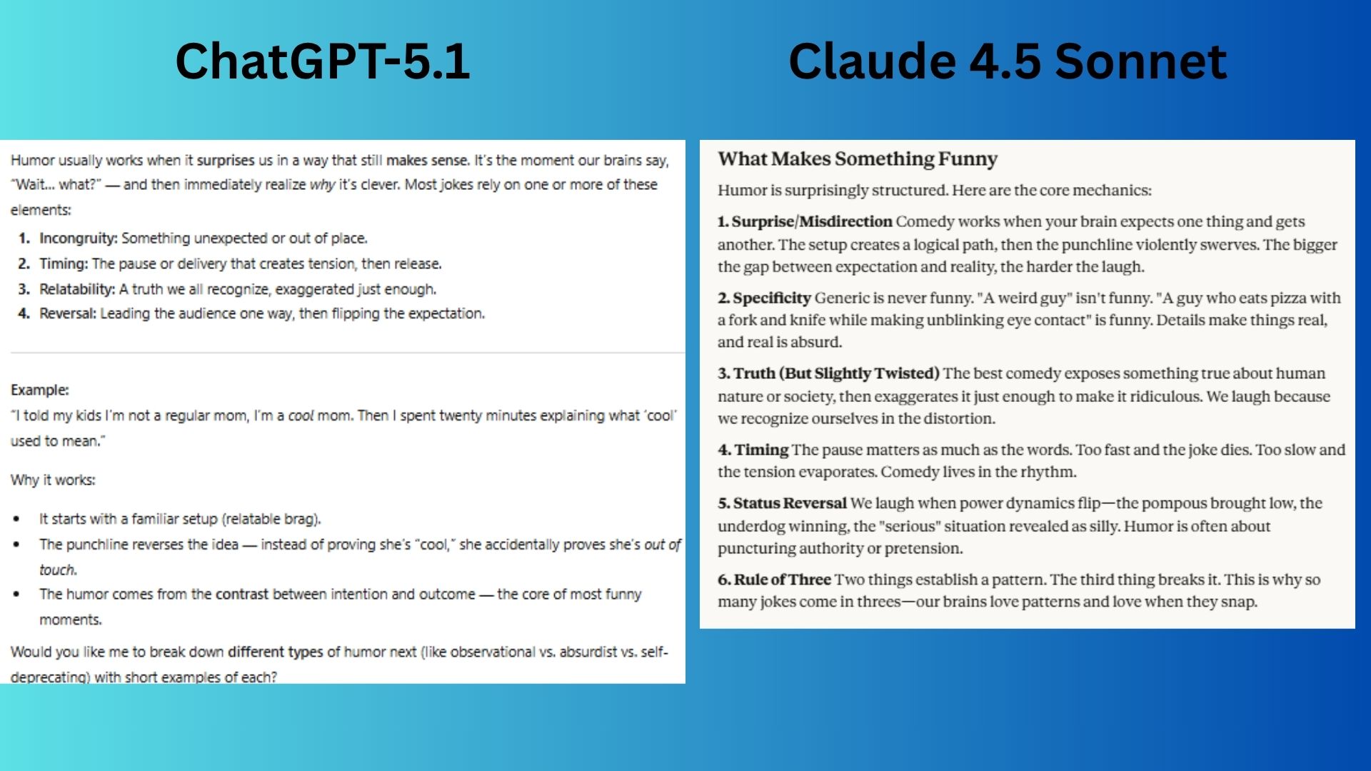 Claude 4.5 Sonnet provided a comprehensive, structured breakdown of comedic theory, complete with six distinct mechanics and a brilliantly crafted original example that demonstrates all of them in action.