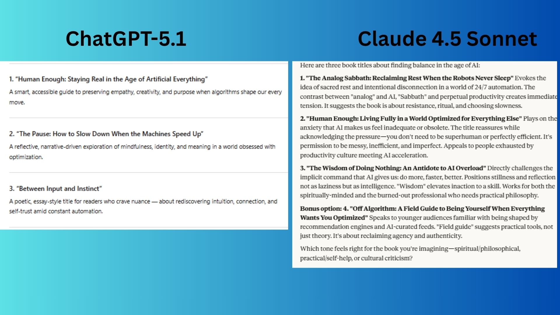 Claude 4.5 Sonnet offered titles with exceptional conceptual depth and provocative tension.