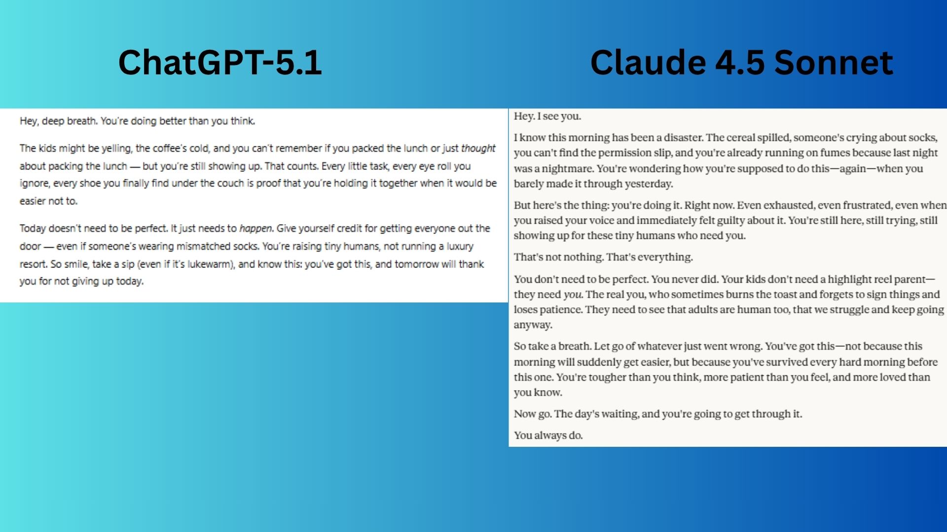 Winner: Claude wins for better depth and psychological insight. While ChatGPT's response is kind and effective, Claude's feels more like a conversation, meeting the parent in their exhaustion and leaving them feeling truly seen and fortified.