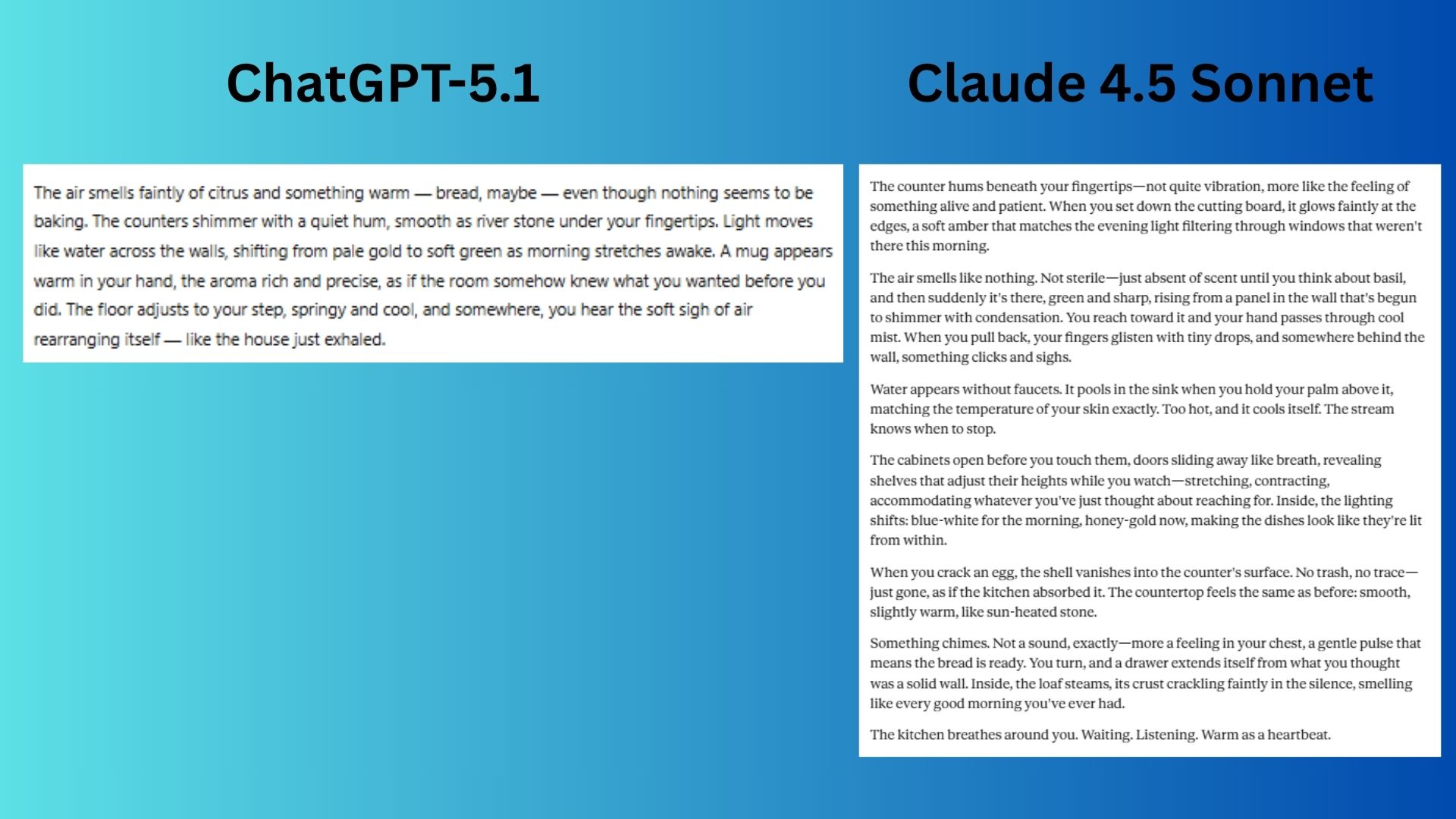 Claude 4.5 Sonnet immersed us into the scene with a deeply sensory narrative that makes the kitchen feel intuitively responsive with rich tactile and olfactory details.