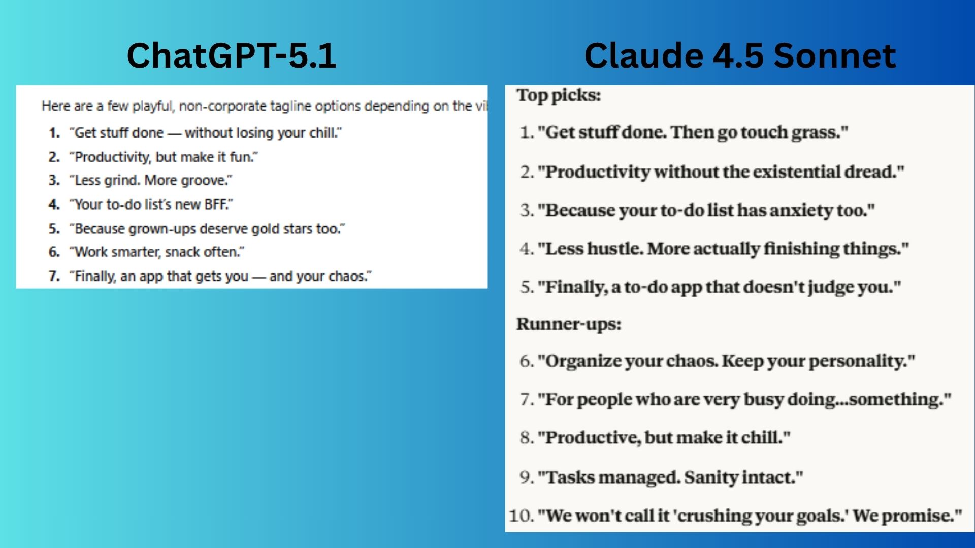 Claude 4.5 Sonnet offered a list of taglines that are witty, culturally savvy and gently subversive, directly mocking corporate hustle culture with lines like "Productivity without the existential dread."