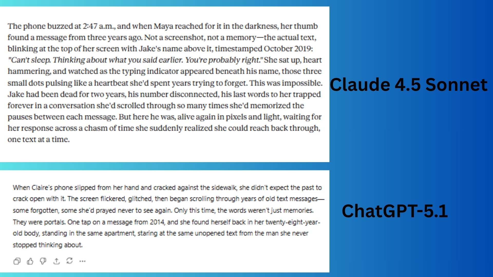 Claude 4.5 Sonnet crafted an emotionally resonating scene by establishing immediate mystery with a specific, impossible message from the dead.