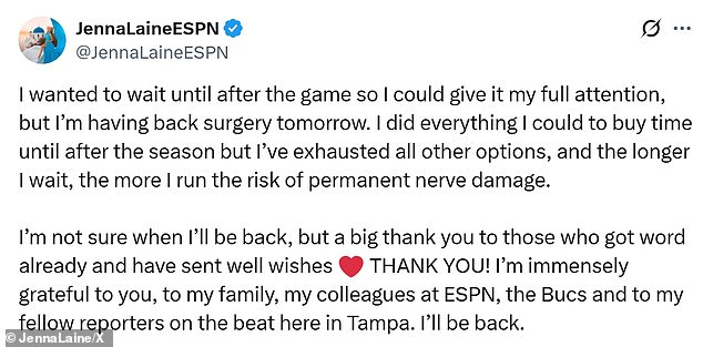 "I wanted to wait until after the game so I could give it my full attention, but I'm having back surgery tomorrow," Laine shared after the Buccaneers lost 23-28. She explained that she had tried everything possible to delay the procedure until the end of the season, but she had exhausted all other options. "The longer I wait, the more I run the risk of permanent nerve damage."