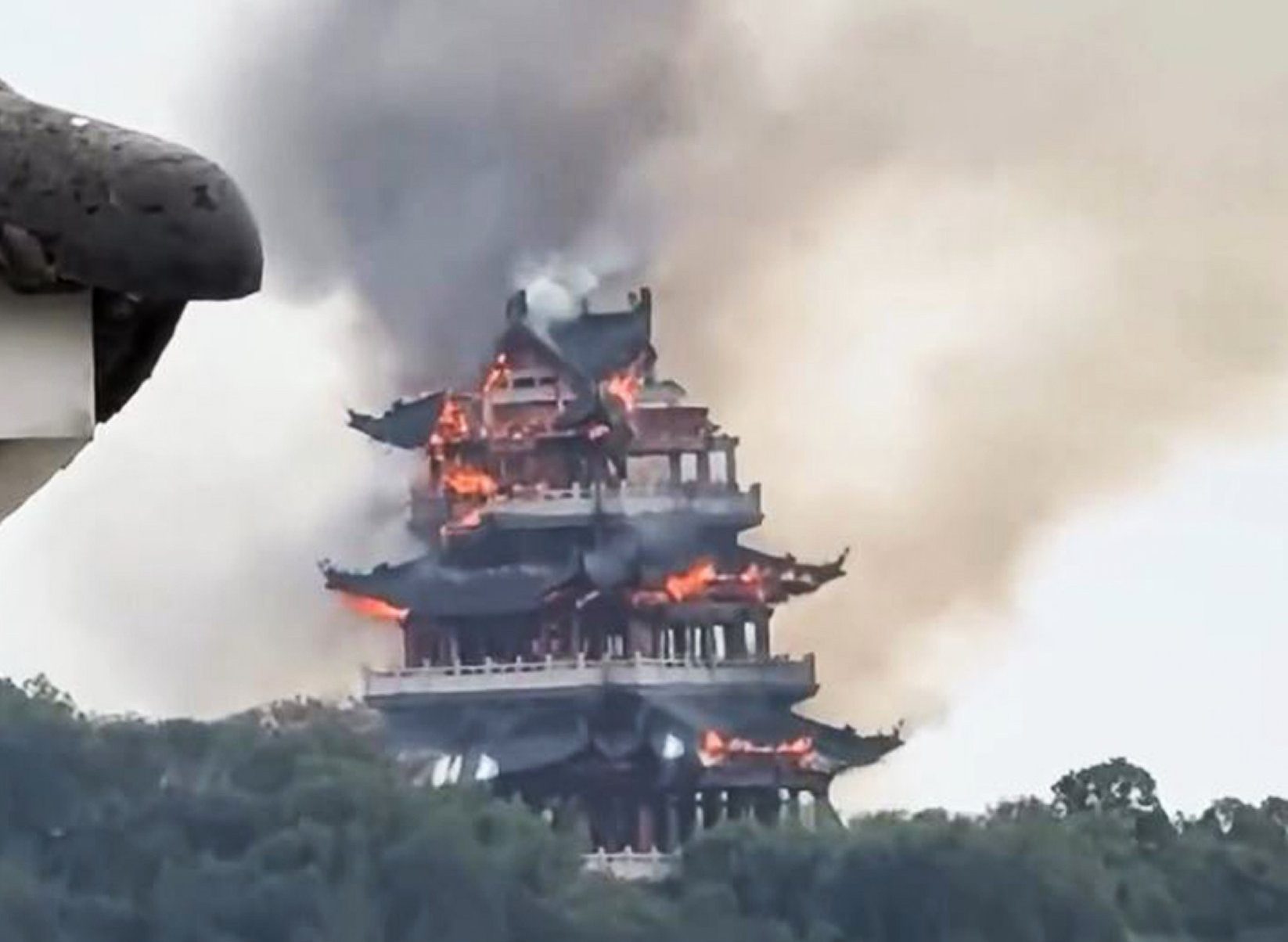 A tragic incident occurred at a sacred temple complex when a visitor's improper use of incense and candles led to the destruction of a pavilion. The fire broke out at Wenchang Pavilion on Fenghuang Mountain in Zhangjiagang, Jiangsu province, China, on November 12th. Dramatic footage captured the three-storey structure engulfed in flames, with thick smoke rising to the sky as pieces of the roof fell from the building.