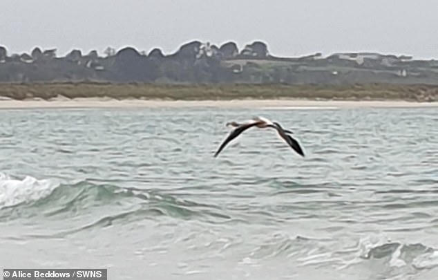 Photographs of the bird have been shared widely in an effort to locate her. One image shows the animal walking alone amidst the waves in Finistère, while another captures a flamingo with the same distinctive reddish head soaring through the sky with its large, patterned wings.