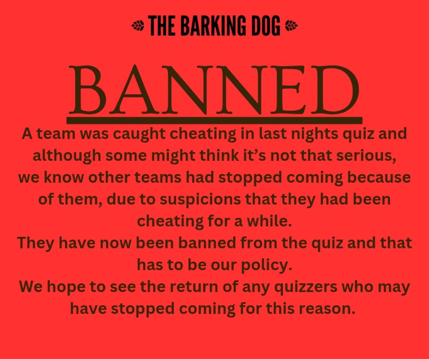 After uncovering the cheaters, the pub posted on Facebook: “We are disappointed to say that there has been a team cheating in our quiz. There have been suspicions for a while but no concrete evidence. This unfortunately may have cost us some genuine custom. Last night we caught the team red handed and they have been banned. We hope that any of our genuine quizzers we may have lost, come back.”