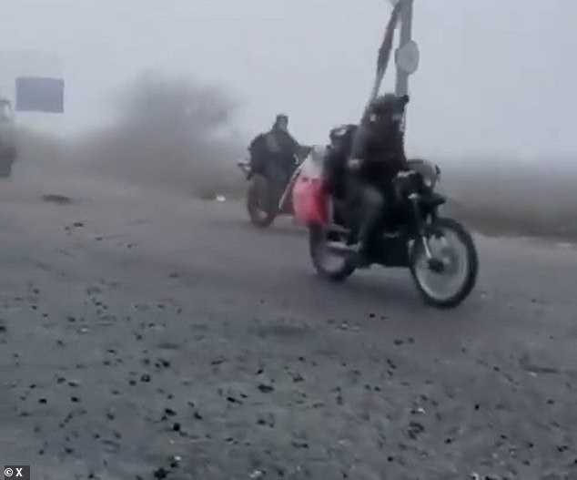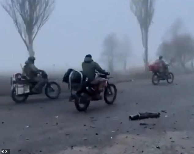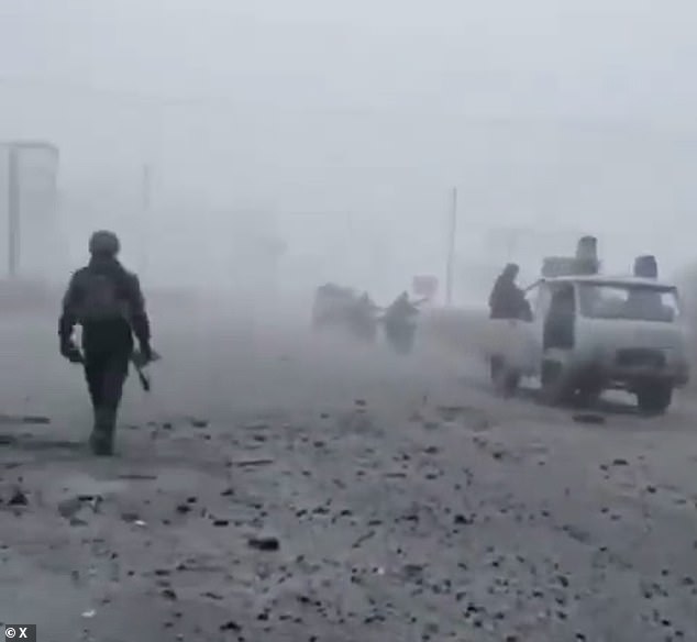 Newly released footage has captured the movement of Russian troops through dense fog, with a convoy consisting of damaged vehicles that have lost their doors and windows. This scene has been compared to the chaotic imagery seen in the Mad Max movies. The video, shared by a reputable news outlet, shows soldiers clinging to battered cars and motorbikes as they move along a road covered in debris. A broken drone is also visible on the roadside, and the column of vehicles disappears into the mist.