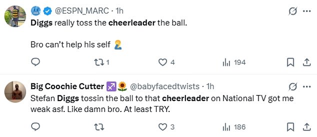 One Amazon Prime viewer commented: "Bro knows what he's doing at this point" with a crying emoji. Another user wrote: "Cardi, get your man. He out her again." A third person added: "Diggs really toss the cheerleader the ball. Bro can't help himself."