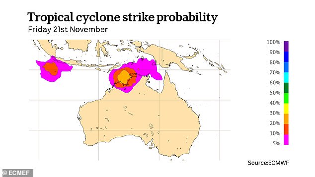 The current water temperatures off the northern coastline are up to two degrees above average, which could lead to an early start to Australia's cyclone season. This environment presents ideal conditions for a low-pressure system to form and deepen in the Timor Sea next week. However, the Bureau of Meteorology has predicted that there is only a 10 per cent chance of this system developing into something resembling a cyclone from Tuesday to Thursday.